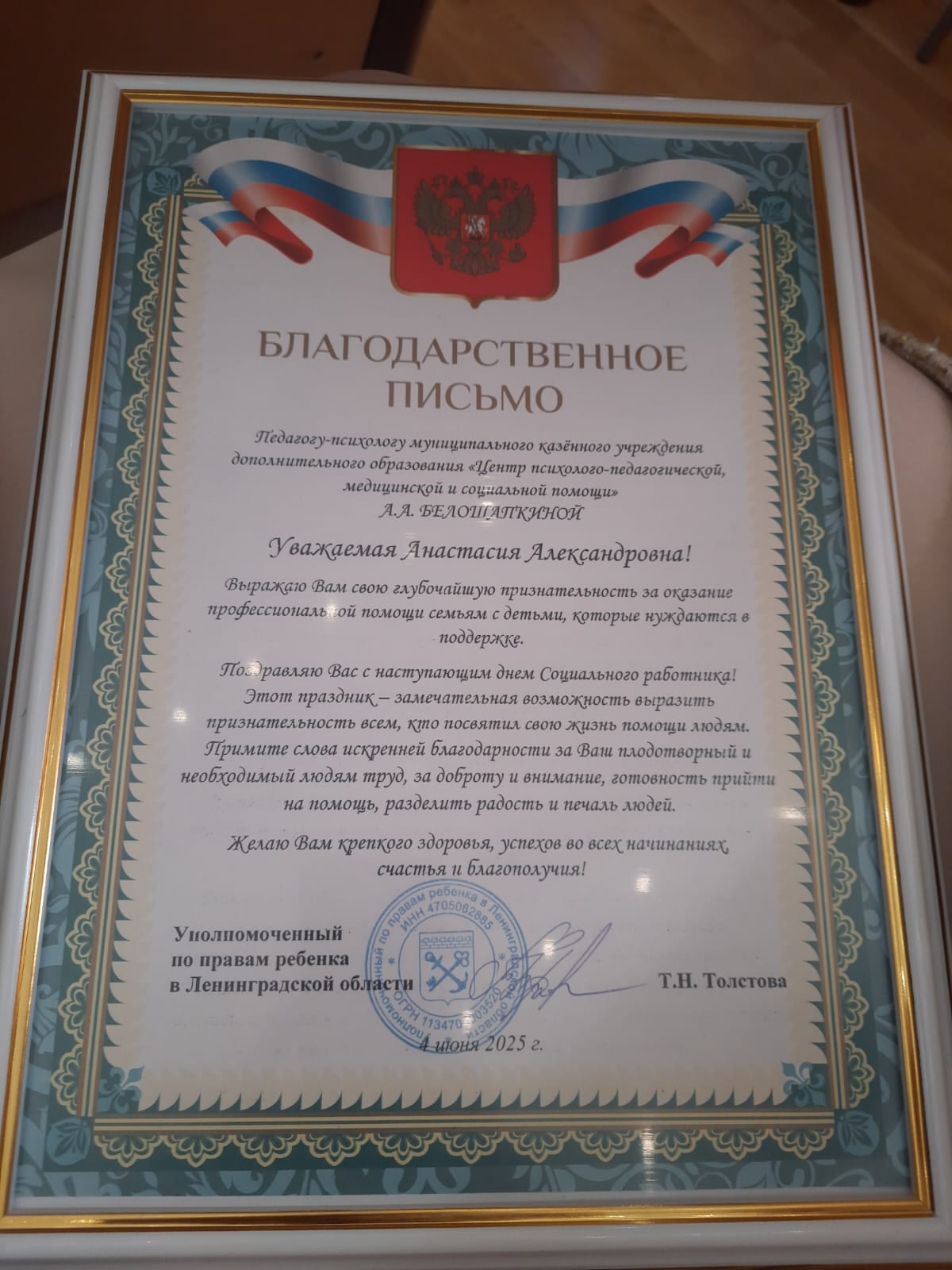 В школе имени Глинки во Всеволожске прошло торжественное мероприятие, приуроченное ко дню социального работника. Представители важнейшей профессии поздравили главы всех уровней, многих наградили городскими, районными и областными наградами, в том числе Благодарственное письмо от Уполномоченного по правам ребенка в Ленинградской области вручили педагогу-психологу МКУ ДО «ЦППМ и СП» Белошапкиной Анастасии Александровне.